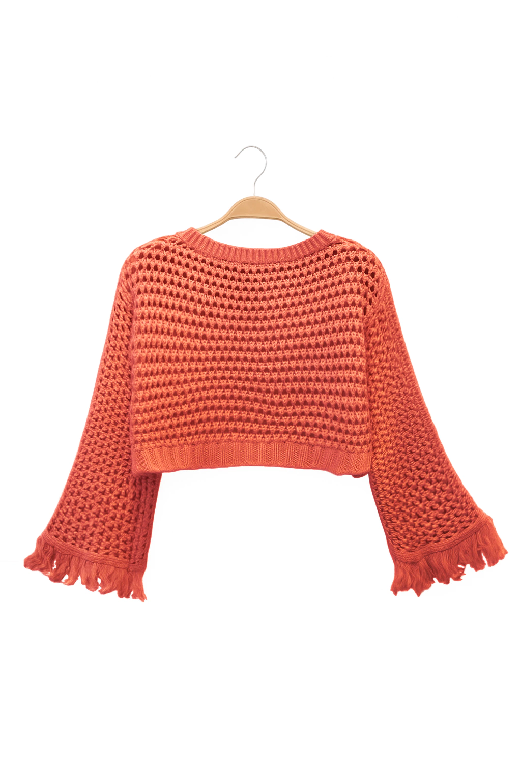 SWEATER CALADO CON FLECOS EN MANGAS, CORTO Y CUELLO BOTE.